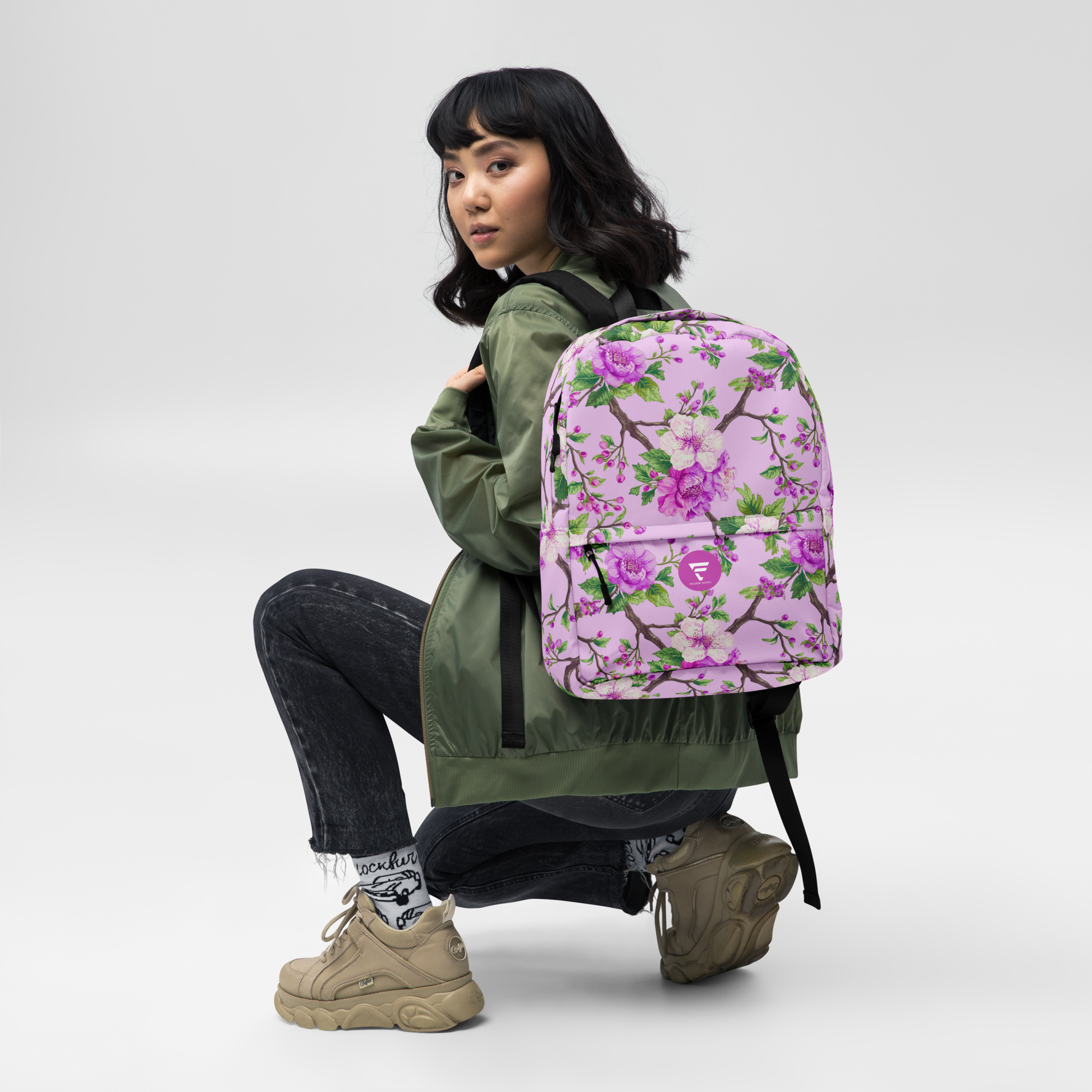 Pink Peoney and Apple Blossom on Lavender | Backpack with Zip Pocket | Premium Luxe